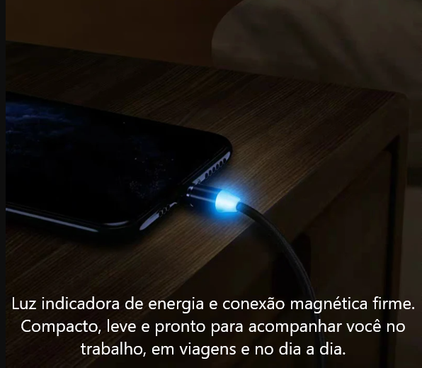 Compatível com iPhone, Samsung, Android, Type-C e Micro USB, ele substitui todos os seus cabos antigos. O sistema magnético facilita a conexão, evitando o desgaste da entrada do celular e garantindo carregamento rápido de até 2.4A.