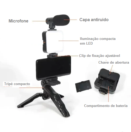 Com apenas 250g, o tripé leve e resistente em ABS garante firmeza nas gravações, mesmo em superfícies irregulares. Seu design compacto permite transportar facilmente e montar em segundos — ideal para criadores em movimento.