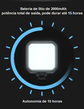 A luz LED de 49 diodos oferece brilho ajustável e iluminação suave, ideal para vídeos noturnos ou locais com pouca luz. Com 3 pilhas AAA, entrega até 1,2 horas de iluminação contínua, sem precisar de cabos.